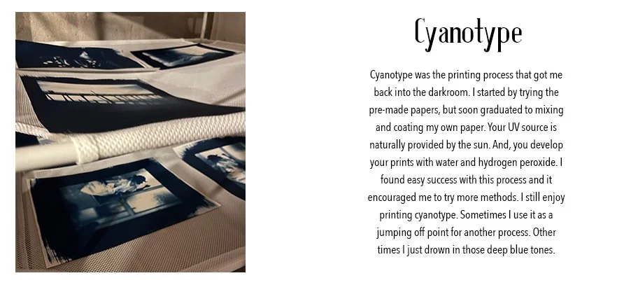 When I graduated from college in 1998, I was unsure how I could continue to work in film based photography. I spent many years lamenting the rise of digital and my lack of resources to continue producing work in my chosen method. Eventually (close to 20 yrs), I realized that I could develop film in my windowless bathroom. That changed everything. I soon began to dabble in cyanotype. This led to me acquiring enlargers and fashioning a darkroom in my basement. I reacquainted myself with film photography, took a few classes in alternative processes, and haven’t looked back. This was 6 years ago.